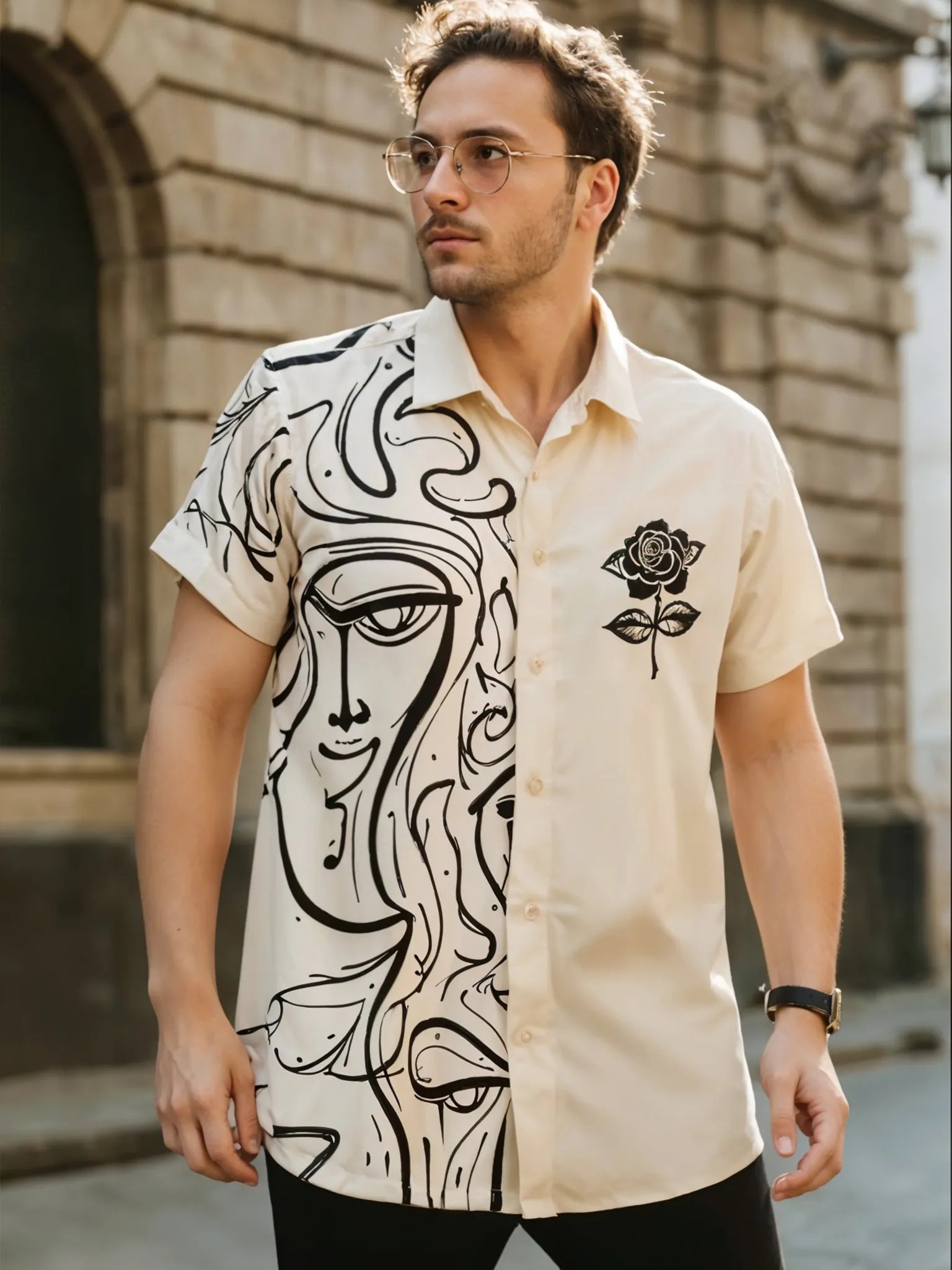 Men's Artistic Face Print Short Sleeve Shirt with Rose Detail – Cream & Black