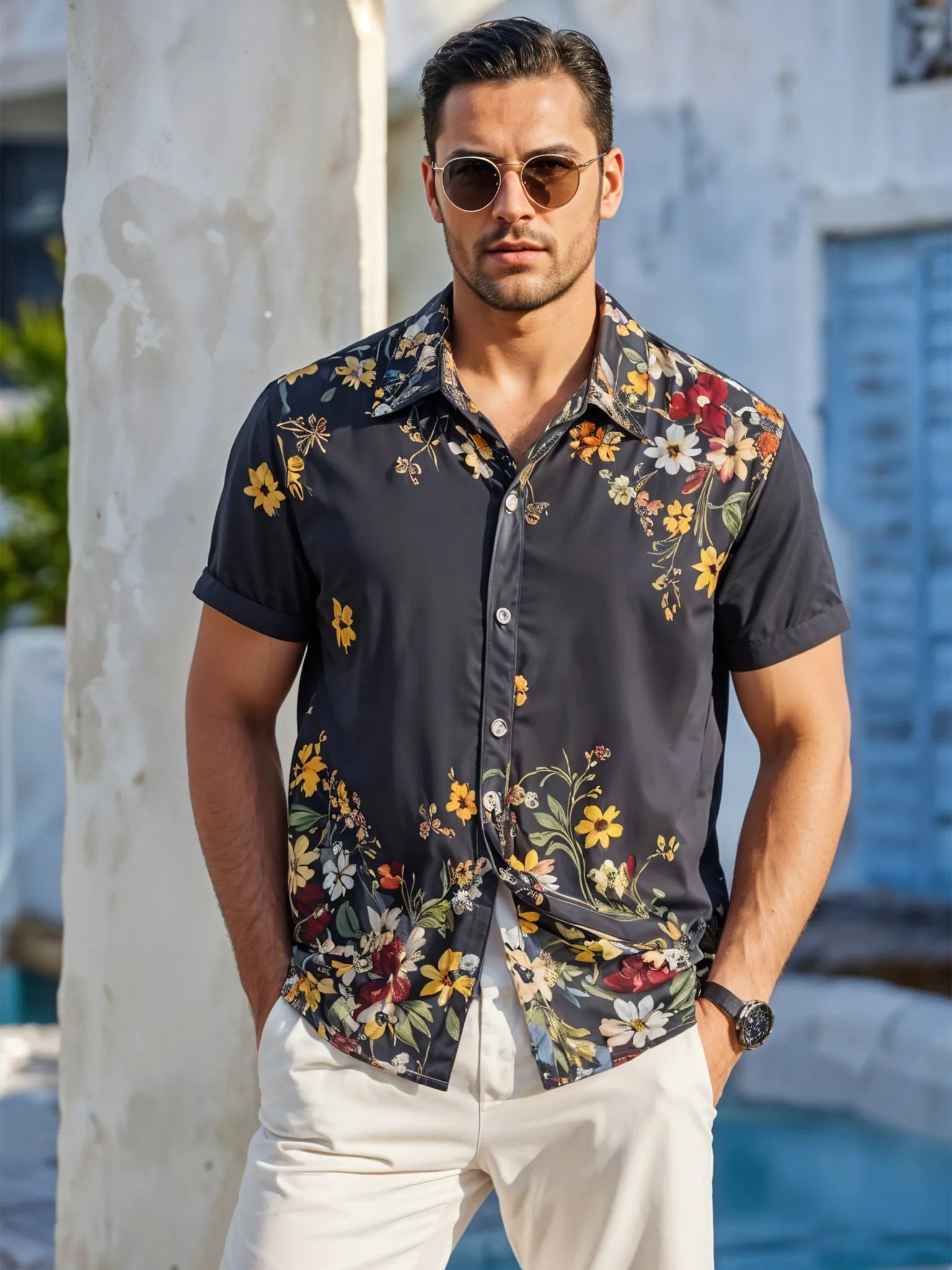 Midnight Bloom Men's Floral Shirt – Black Button-Up with Vibrant Garden Print