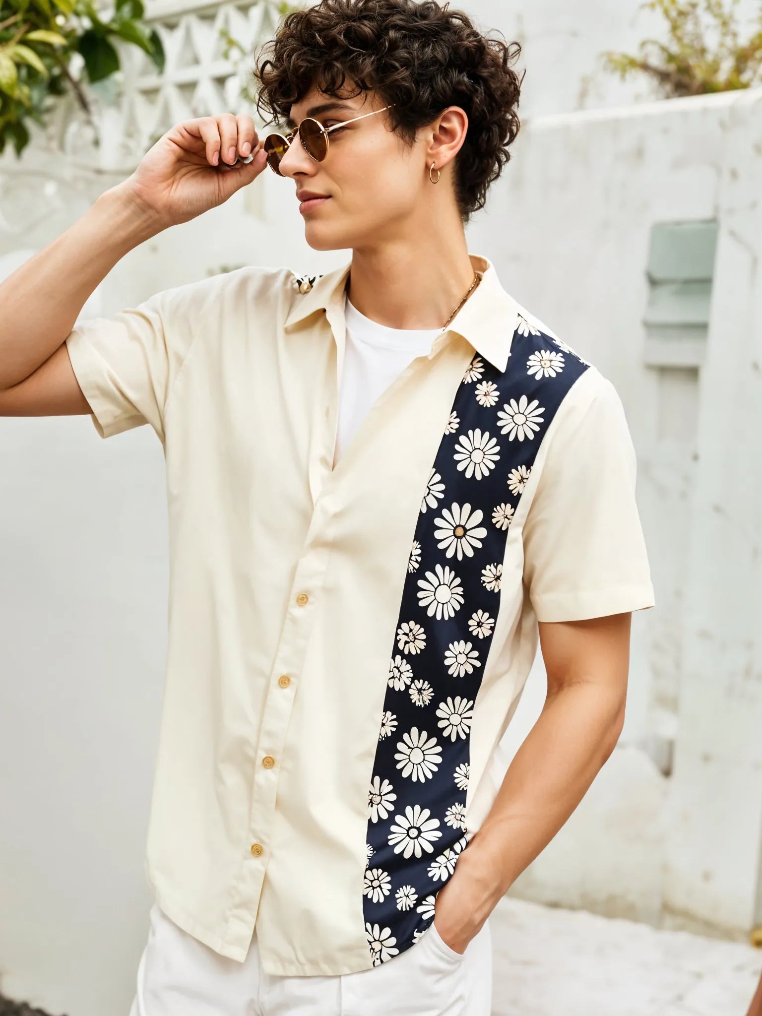 MonoBloom Contrast Shirt – Cream Casual Button-Up with Bold Daisy Stripe