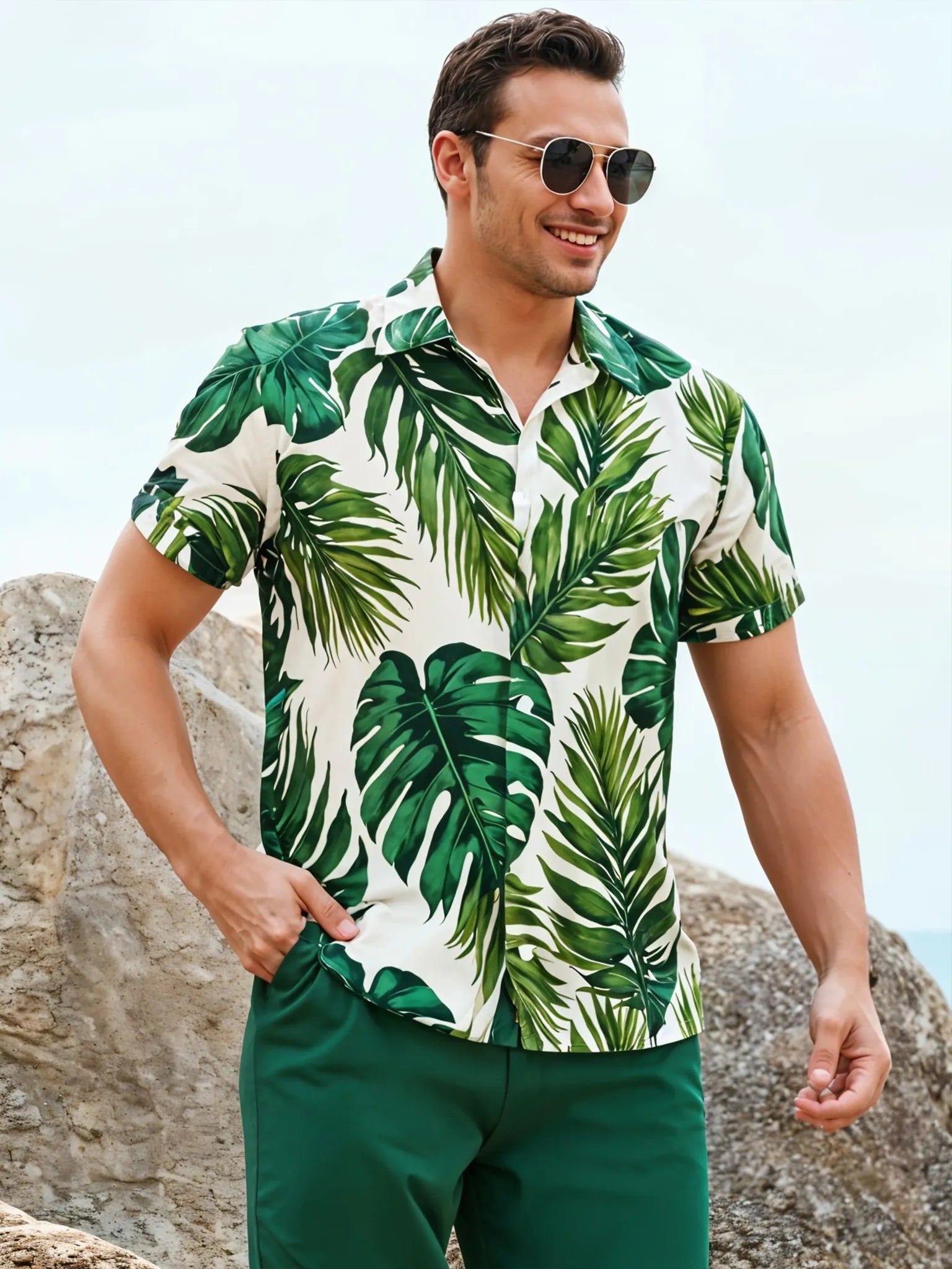 Tropical Breeze Men's Leaf Print Shirt – Green Jungle Vibes on White